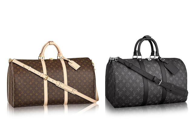 上圖左邊的經典老花55裝配了肩帶,這恐怕也是最常見的Keepall,這個大小能夠攜帶的物品比一個21寸的登機箱多一點,一般都是國際旅途的時候我會選擇這個尺寸的作為登機用。如果主要為了配搭造型而不是為了“實用”,從視覺角度而言,身高180cm以下的人用55以及60大小有點比例失調,顯大。