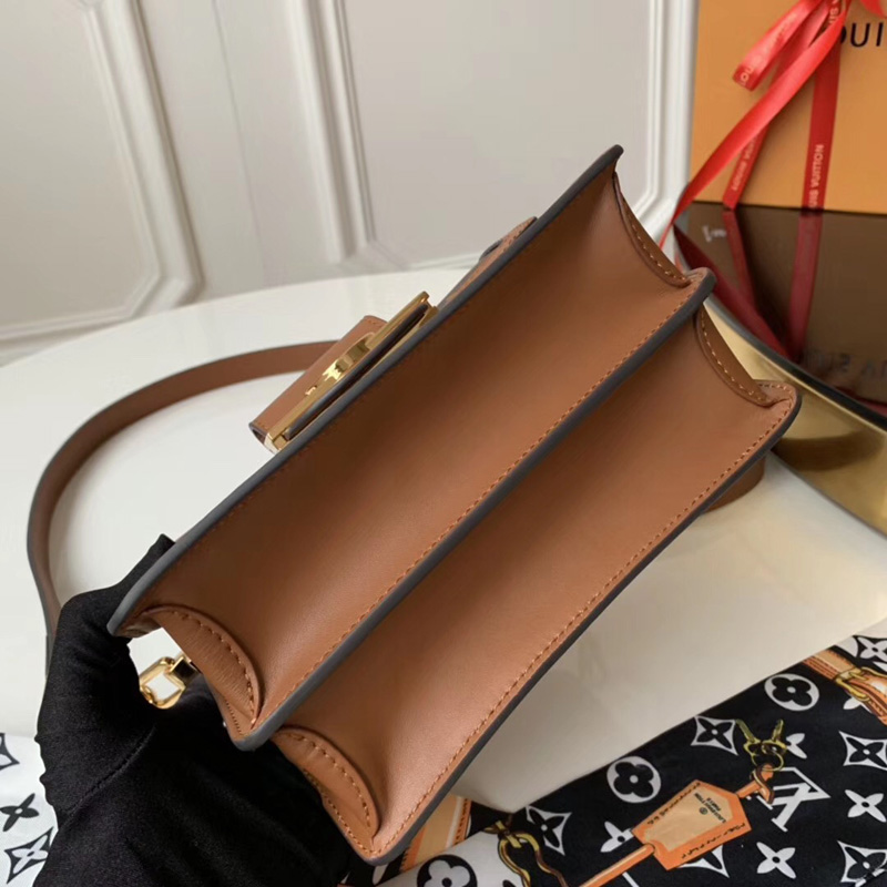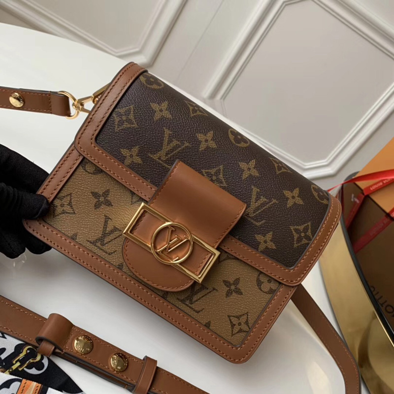 Mini Dauphine的外形接近于一個正方形(20x15cm),四周圍有棕褐色的小牛皮飾邊,配有一根可以調節和拆卸的皮質肩帶。