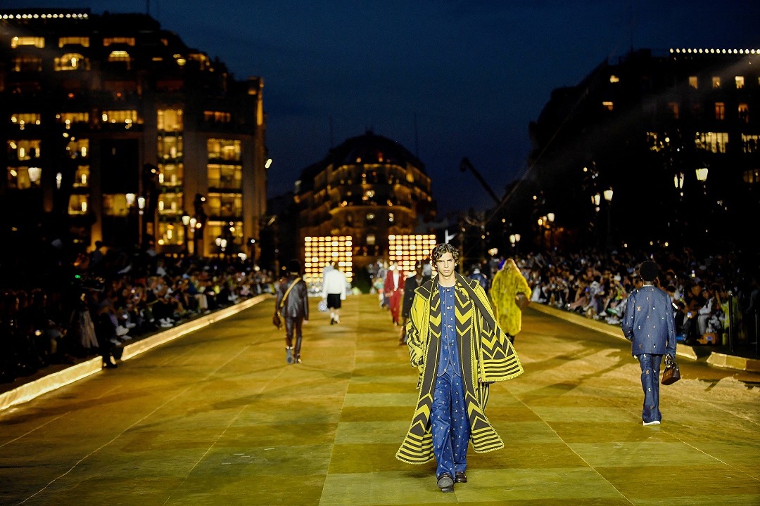 秀場選址于塞納河畔的巴黎新橋(Pont Neuf),與不遠(yuǎn)處的 LV 工作室相望,新橋體現(xiàn)著巴黎與 Pharrell Williams 的家鄉(xiāng)弗吉尼亞州之間的隱喻聯(lián)系。橋面裝飾以金色 Damier 棋盤格圖案并以舞臺(tái)聚光燈為背景墻,呼應(yīng)「太陽」主題。