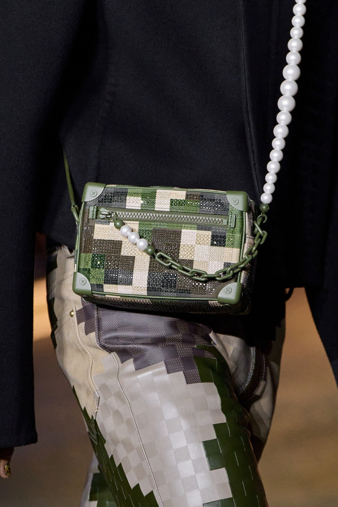 全新「Damoflage」圖案將經(jīng)典 Damier 棋盤格與迷彩紋理糅合,展現(xiàn)兩種不同風(fēng)格的碰撞與交融。Soft Trunk 軟盒包在迷彩棋盤格上鋪鑲晶瑩剔透的水晶并飾以人造珍珠和鎖鏈肩帶,呈現(xiàn) Pharrell 與已故創(chuàng)意總監(jiān) Virgil Abloh 的創(chuàng)意傳承。同系列還有相機(jī)包、旅行袋、雙肩包、鞋箱以及小熊玩偶等單品,綠色迷彩紋理為包包增添 Urban Outdoor 氣息。