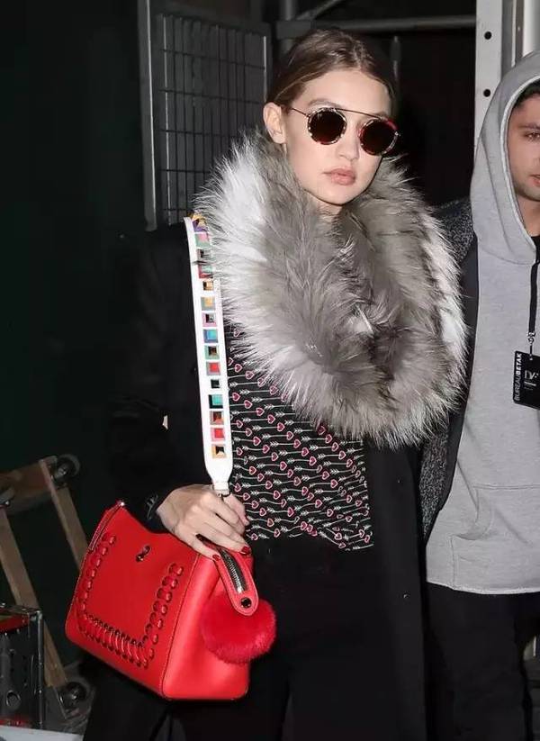 性感超模Gigi Hadid則選擇了一款亮紅色DOTCOM配上白色彩釘款寬肩帶,這搭配有點太吸睛了吧?