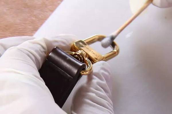 ……就神奇了!需鍍色的五金一邊連接上鍍色設備的陰極電流夾,一邊用沾取了電鍍液的鍍筆進行擦拭(又稱電刷鍍,LV的金屬鉤環為陰極,借助電化學方法,以浸滿鍍液的鍍筆做為陽極,讓鍍液中的金離子在LV金屬鉤環上放電結晶,形成金色鍍層……化學不好的一姐很懵逼??),然后LV掉色的五金就神奇的一點一點變成金色了,好一個神筆馬良再現!