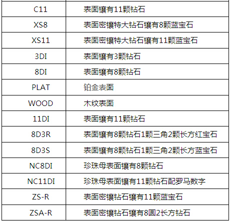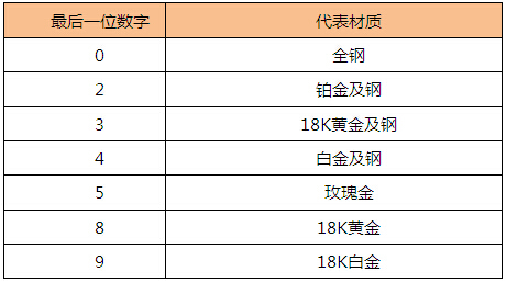2、最后一位數字代表材質 勞力士手表的產品命名最后一位數字就是材質的代表,比如“0”代表全鋼,“9”代表18K白金材質等。