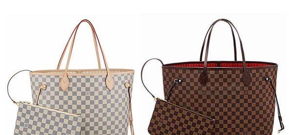 Neverfull有4種材質(zhì):白棋盤格,棕色棋盤格,老花(Monogram帆布),純色款。