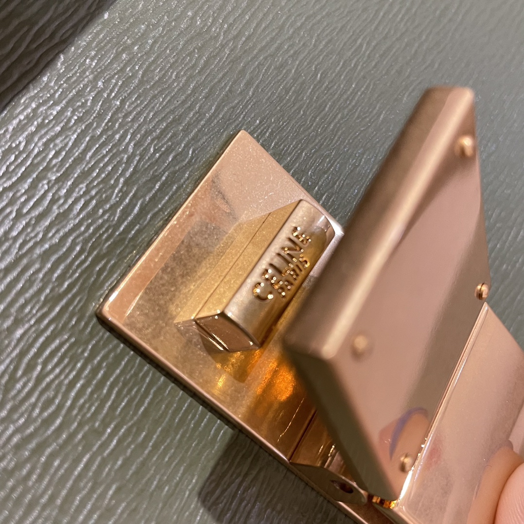 CELINE BOX整個包的五金部分都是純銅表面電鍍24k真金,五金表面的做舊效果是通過振機打磨,也就是機器反復撞擊后形成的“磨花”效果,不過要強調的是,雖然五金看起來“磨花”,實際上表面非常的光滑。