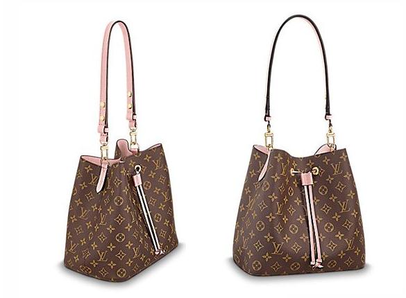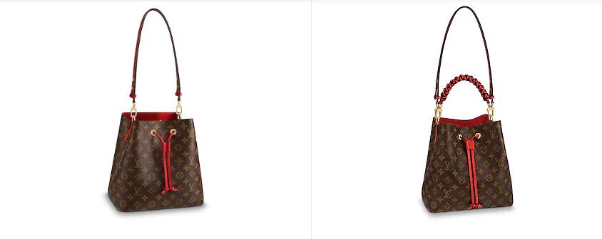先來看最火的中號水桶包,NéONOé 手袋,尺寸是:26.0 x 26.0 x 17.5 cm。容量大,日常需求絕對沒有問題。她有多個黑色,紅色,粉色,藍色等等多個顏色,分為老花Monogram帆布材質(zhì)和EPI真皮材質(zhì)。其中有印花款,另外還有新出的帶編織的手柄款。具體看下圖。