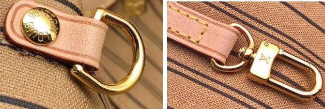 1)拉鏈的復制難度較大。 LV的五金硬件是顏色稍深的青銅,具有啞光的質感,而不是亮金色的金屬。而假冒的LV Neverfull的拉頭帶有黃色底色的銀色,且過于有光澤。