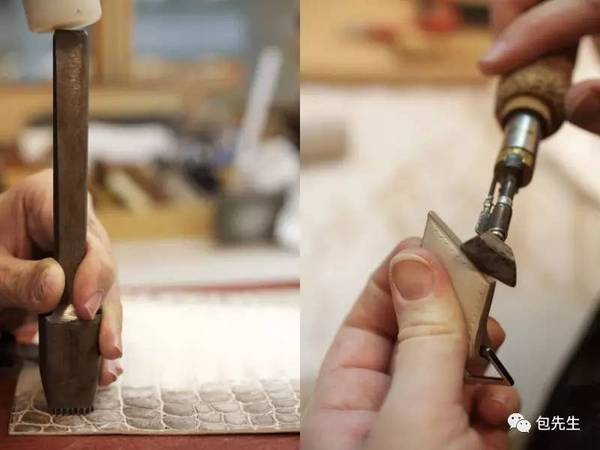 在我們看到的制包的很多環節中,我印象最深刻的就是鉑金包包扣那一步。可能我們在用包的時候都不會太注意到,但是包扣四角圓圓的小突起,其實不是直接隨著金屬件來的,是為了把金屬扣固定在皮上,之后敲上去的。