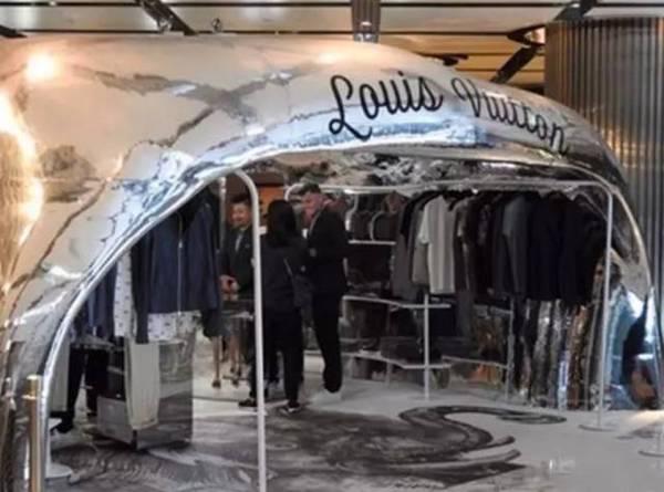 簡單來說,3D打印大機器耗費兩周把銀色屋頂打印出來,然后LV帶著自家的男裝和鞋子鉆進去擺攤賣東西。