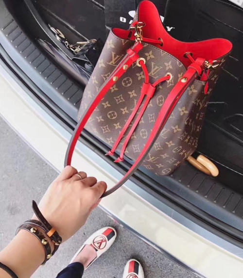 Monogram帆布與鮮亮的大紅色搭配更時尚洋氣,很喜歡這款水桶包,旅行時記得帶上
