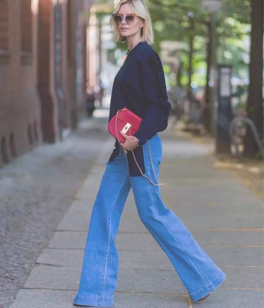 時尚的深藍色上衣配下面經典藍的牛仔闊腿褲,
