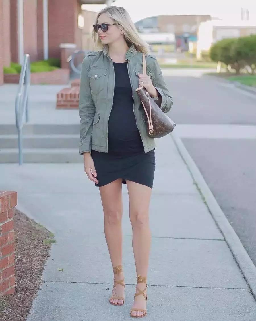 帥氣的黑外里面配上長裙,造型干凈利落。