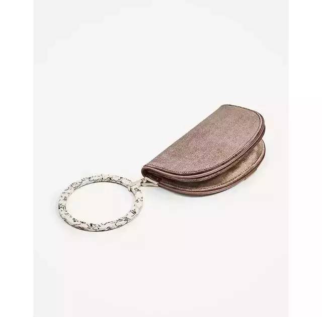 月牙形的包身和金屬手提環(huán)讓它整體剛?cè)岵?jì)