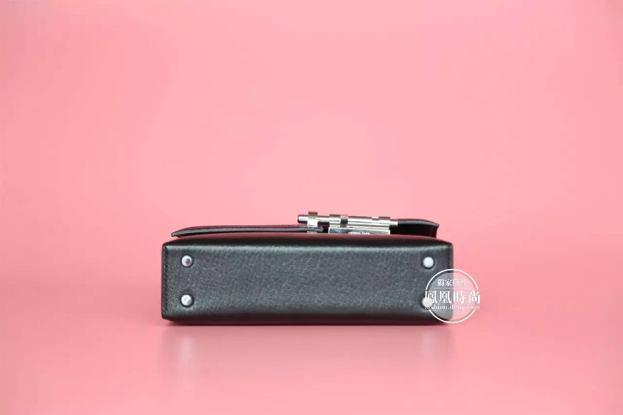 接下來來看包包最大的設計亮點—鎖扣啦,兩根鎖銷確保包包穩穩扣合,設計很靈巧,開合自由,撥動豎直插銷之后,牽動位于扣眼處的水平鎖銷相應開啟,鎖扣即可開合。