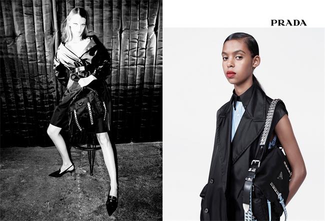 Prada的基石,有其傳承意義與精神內(nèi)涵。黑色尼龍(或tessuto vela)是對工業(yè)面料的奢華再定義。Prada 2018春夏系列和最新Prada 365廣告大片以此靈感。