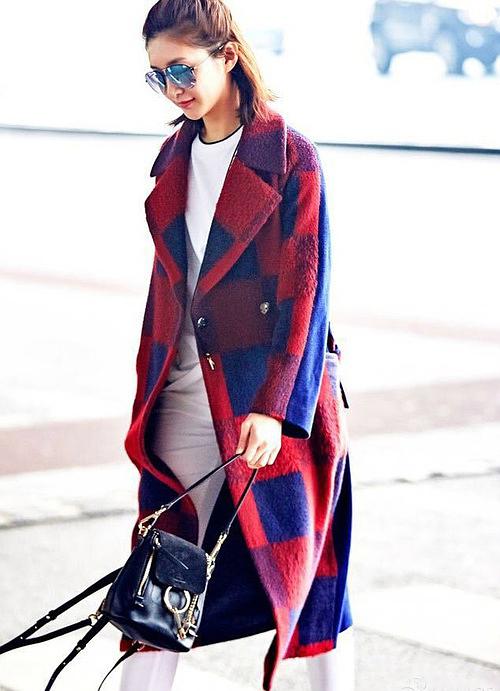 江疏影同學身穿彩色長大衣,手中拎著Faye Mini 雙肩包隨意搖曳,悠閑地漫步著