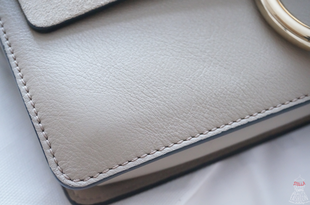 材質是滑面的小牛皮混搭絨面的小牛皮(麂皮),麂皮稍微要小心照顧,比較容易有刮痕或是臟掉,但這樣混搭起來,真的蠻特別,不會覺得整個包都是單一滑面小牛皮而單調,麂皮蓋子上烙有Chloé品牌,真的美噠噠呀!