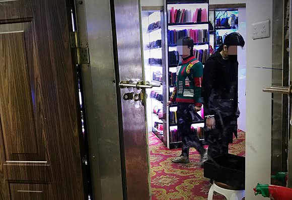 阿梅將記者帶到皮具城的11樓,在一間沒有門牌號的房間外停下。門口有名男子正低頭玩著手機。阿梅向他使了個眼神,再抬頭看了看門梁上的監控攝像頭,男子起身把門拉開。