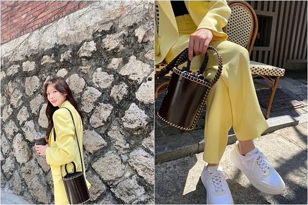 去年剛獲得青龍獎最佳新人獎殊榮的韓國女演員──孔升妍,則是身著鵝黃色西裝、手拎烏木棕Louela水桶包、腳穿Nama休閑鞋,悠悠漫步在街頭,溫柔中略帶俐落的中性美感不言而喻。