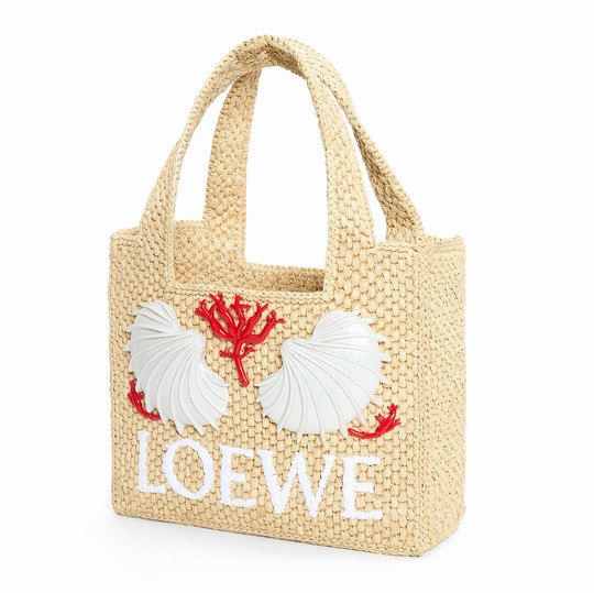 Font Tote 托特包采用天然拉菲草編織而成,最大亮點是包身裝飾的貝殼和珊瑚圖案采用 3D 樹脂外殼和刺繡手工裝飾完成,彰顯品牌匠心工藝。