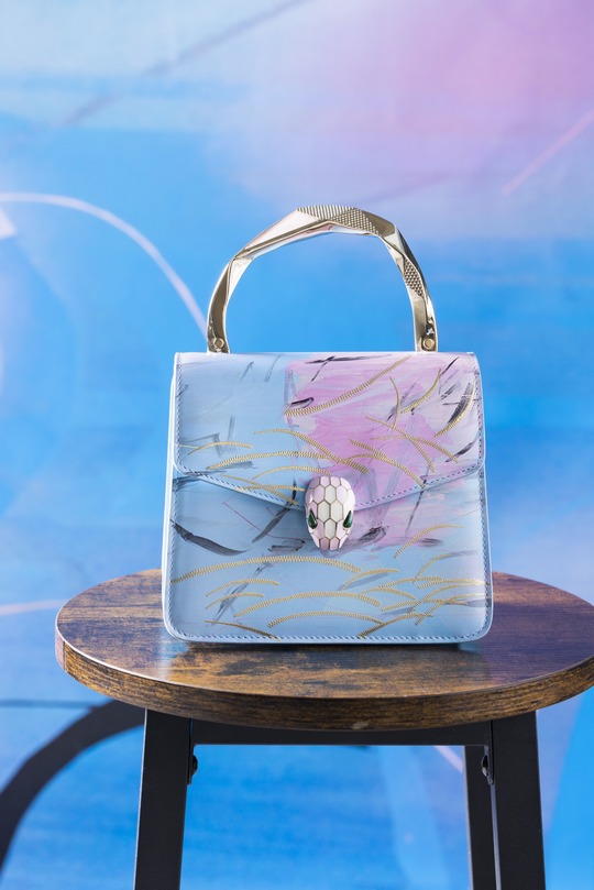 新作中最引人注意的是中國藝術家周力詮釋的2款 Serpenti Forever 手提包,以溫柔繾綣的抒情抽象畫裝飾包身,不規(guī)則幾何形黃銅手柄與金色鏡面相映成輝,并鑲嵌以包身同色系寶石——孔雀石和粉色石英石,靈感來自周力的巨型雕塑裝置《生生如環(huán)》,致敬靈蛇的象征意義,展現(xiàn)中西文化、金屬與寶石的碰撞交融。