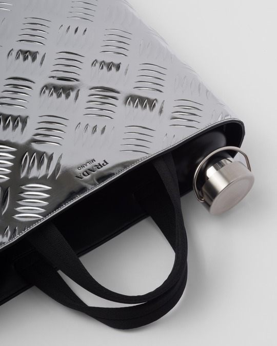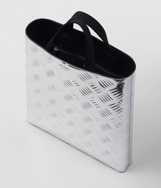 Prada 剛剛上市2023秋冬男士作品,由聯(lián)合創(chuàng)意總監(jiān) Miuccia Prada 和 Raf Simons 合作設(shè)計。全新托特包采用流線型包側(cè)并內(nèi)置可拆卸保溫瓶,最引人注意的是2款銀色金屬質(zhì)感包袋,其上熱印壓花浮雕圖案,靈感來自工業(yè)金屬板。