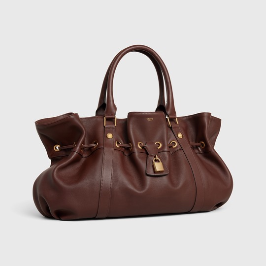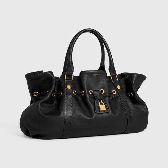 Abbey 手袋像是一只俏皮飽滿的餃子,采用「46x32x13cm」大容量廓形,柔軟粒面小牛皮通過抽繩束口,呈現浪漫花邊般的「褶裥」,包包中央懸垂一枚金色黃銅掛鎖,整體造型復古又慵懶。