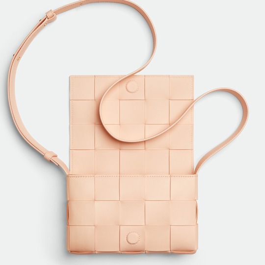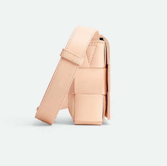 Cassette 斜挎包以5x3的大方格亮相,馬卡龍色有點(diǎn)像是更明亮的杏仁色,點(diǎn)亮整體穿搭造型。