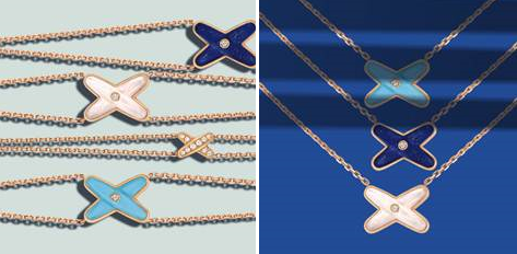 CHAUMET 首次將天然寶石運用在Liens緣系•一生系列:其中代表擁抱與緣份的經典“X”連結符號創新性選用了白色珍珠母貝、藍綠綠松石和藏青青金石,并以三維立 體工藝雕刻后再鑲嵌上一枚精致鉆石,色澤的搭配好似一股清泉,在陽光照耀下熠熠生輝。從此,時髦情侶間又多了一種抒寫浪漫的愛情宣言。