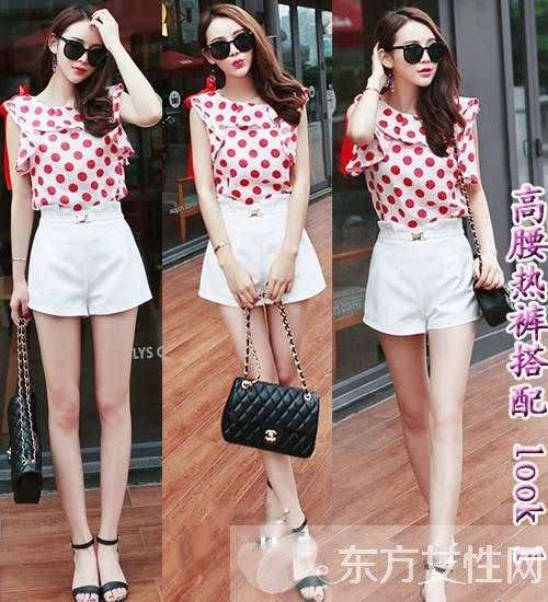時尚點評:白色高腰熱褲是今年流行的元素,清爽時尚又百搭。紅色波點雪紡加上荷葉邊的點綴,甜美清新,塞入短打下裝中,不僅顯腰身還能拉長腿部線條曲線,顯高又顯瘦。