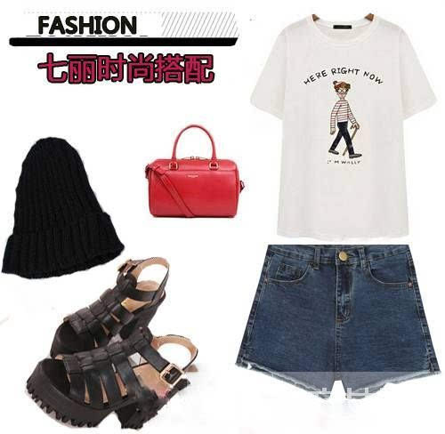 搭配單品:牛仔高腰短褲+白色T恤+紅色包包+涼鞋+尖頂帽