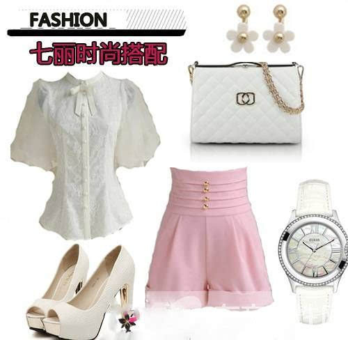 搭配單品:粉紅色高腰褲+白色蕾絲襯衫+白色單肩包+白色高跟鞋+手表