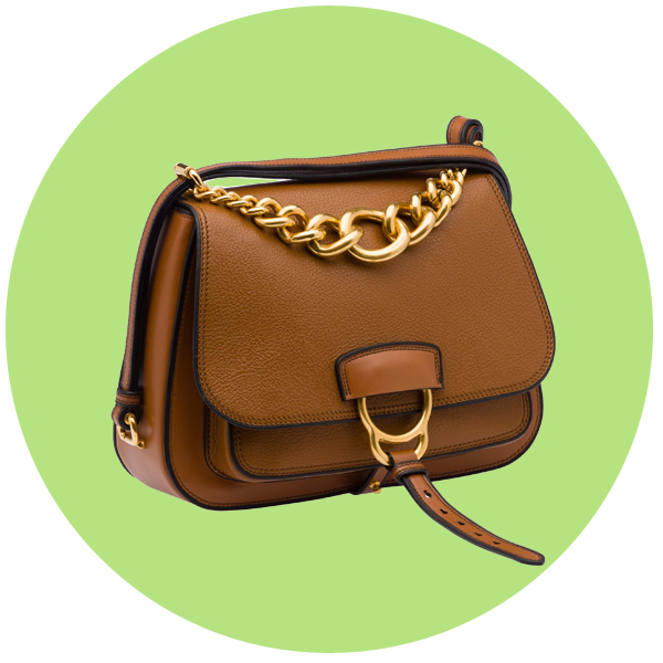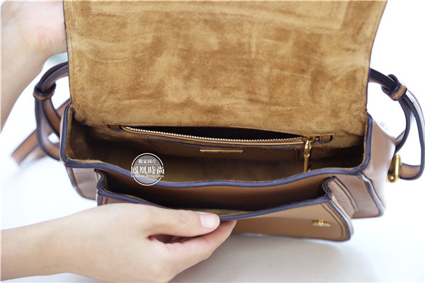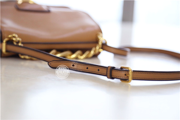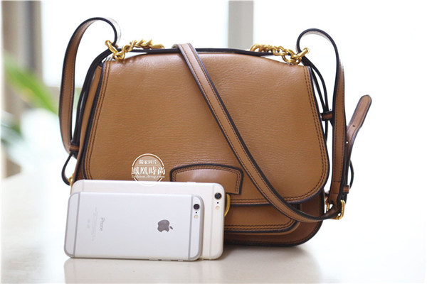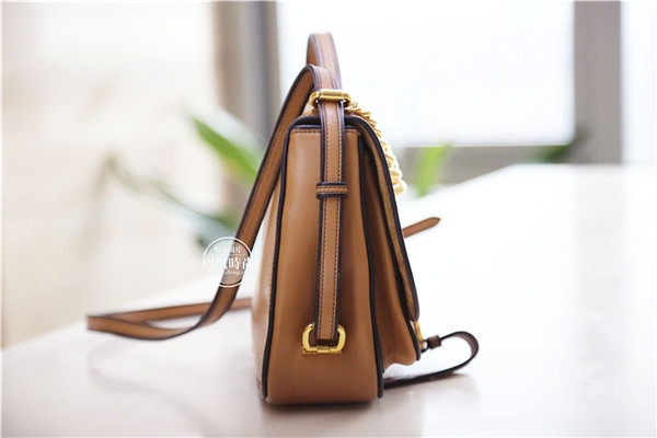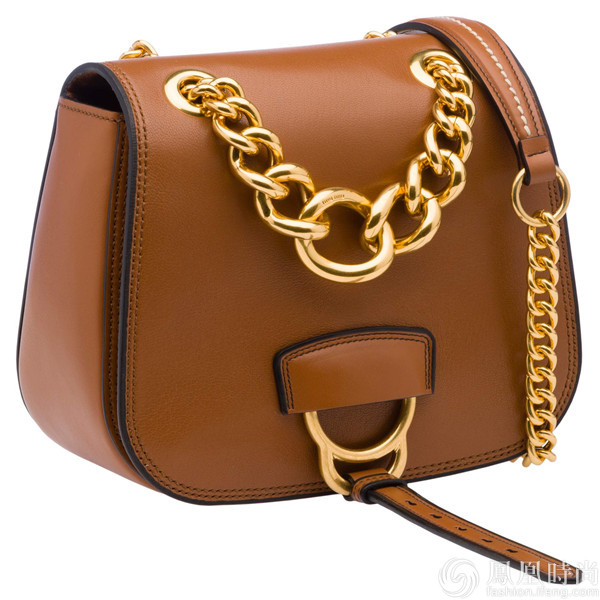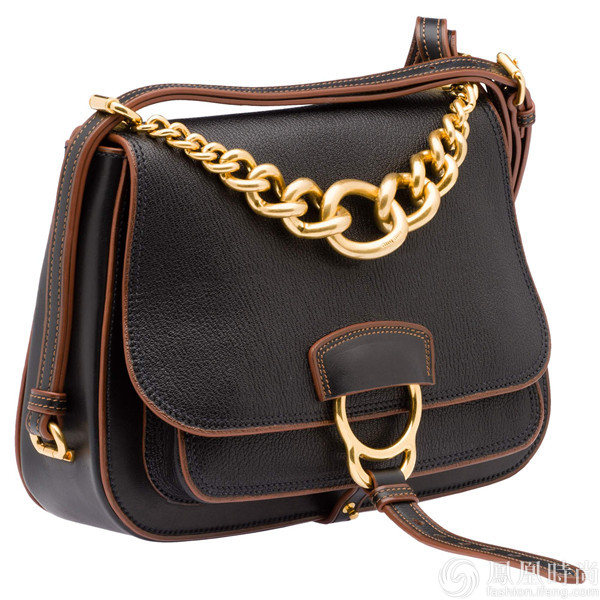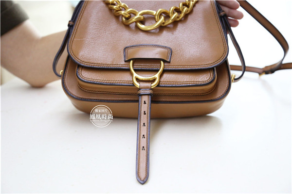 包包整體呈經(jīng)典馬鞍包形狀,棕色包身的邊緣線是黑色皮革,正中間有金屬扣和一個(gè)短皮帶裝飾,這也是馬鞍包必不可少的細(xì)節(jié)之一。包包頂部的金屬粗鏈條是最亮眼的地方,這不僅是裝飾,還可以用來(lái)拎包。
