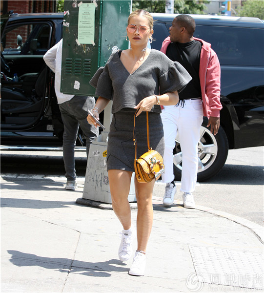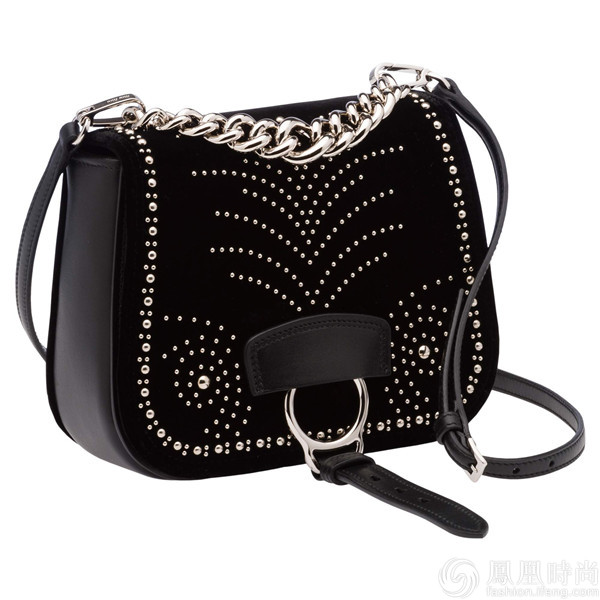 包包的金屬環(huán)下系著一條短皮帶,上面有馬蹄狀的打孔設(shè)計(jì)