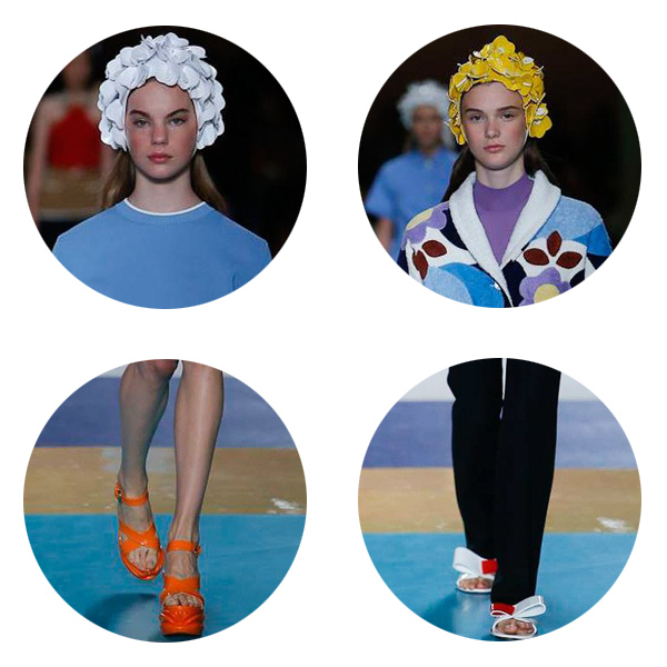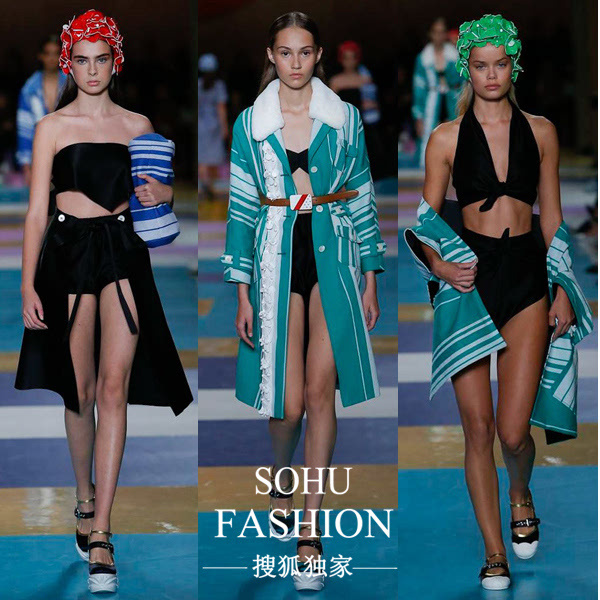 準(zhǔn)備好去度假了嗎?Miumiu連防曬服、雨衣、浴帽都給你準(zhǔn)備好啦!幾乎調(diào)色盤上所有的顏色都做成了浴帽,花朵的形狀層層疊疊,金屬色彩的厚底鞋,多彩的蝴蝶結(jié)拖鞋,性感的比基尼,讓人忍不住希望夏天快快到來,還不快快減肥,來一場浪漫的度假之旅吧!